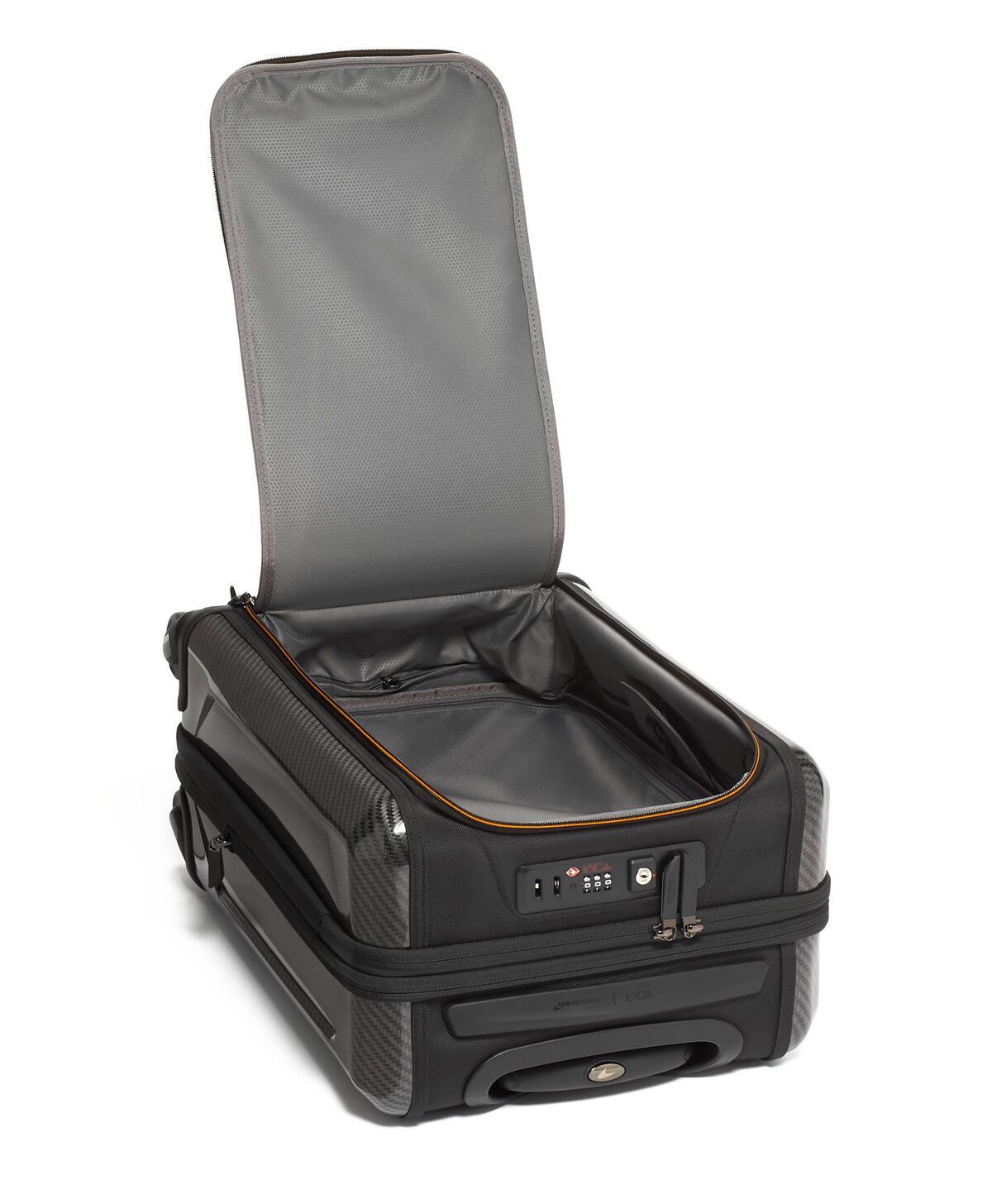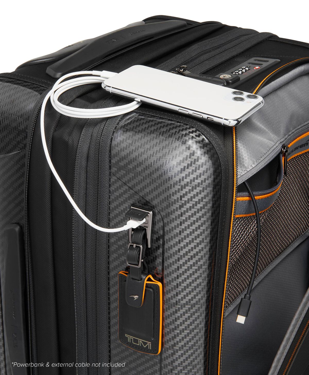 The engineering science behind McLaren and the product innovation of TUMI have come together for a seamless integration of lifestyle, fashion and technology. Echoing automotive design, this carry-on is crafted with a mix of exceptionally durable materials including Tegris®, an aero-inspired molded front panel, and CX6®carbon fiber accents throughout. The influence continues with compression straps reminiscent of McLaren's 6-point harness, while Papaya highlights bring a signature touch. Complete with a USB port, this expandable case delivers superior functionality and versatility without sacrificing design.